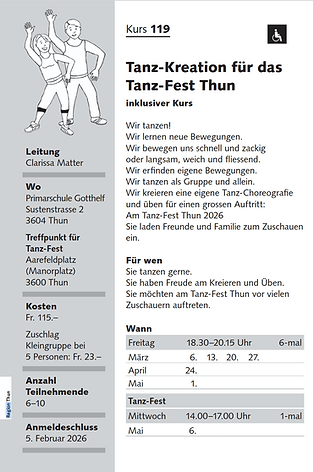 Vom 6. bis 10. Mai 2026 kommt das Tanzfest zum fünften Mal nach Thun, mit einem reichhaltigen Programm für alle Menschen, Jung bis Alt - zum Zuschauen und Mitmachen, sich Bewegen und Bewegen lassen und miteinander den Tanz in all seinen Facetten Erleben, Feiern und Geniessen!